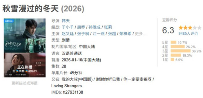 {jz:field.toptypename/}二者的差距确实明显。评分网站上,《我的大叔》高达9.4分,而《秋雪漫过的冬天》一直拖到快收官才开分:6.3分(截至发稿前该剧豆瓣评分6.7分)。