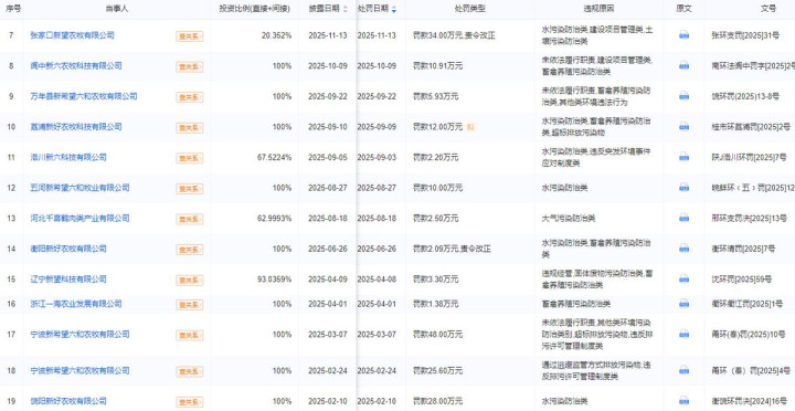 新但愿旗下子公司因混浊问题遭到大额罚金的情况并不有数,比如张家口新望农牧有限公司2025年11月13日被张家口市生态环境局处以罚金34万元、宁波新但愿六和农牧有限公司2025年2月24日和3月7日被宁波市生态环境局辩认处以罚金25.6万元和48万元、饶阳新好农牧有限公司2025年2月10日被衡水市生态环境局处以罚金28万元。