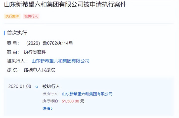 不仅仅上述问题,新但愿还有多家子公司成为了被实行东谈主或失信被实行东谈主。本年1月8日,山东新但愿六和集团有限公司被列为被实行东谈主,实行方向5.15万元,实行法院为诸城市东谈主民法院,为初度实行。