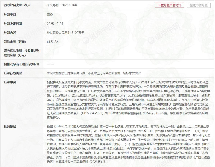 新但愿旗下子公司2025年临了一次遭到处罚是在2025年12月26日。客东谈主市生态环境局行政法则东谈主员于2025年11月5日对客东谈主新好农牧有限公司陈流育肥场进行访问时发现,该公司存在未罗致步骤退缩排放靡烂气体、抵拒日起先混浊防治表情通过躲闪监管的口头排放大气混浊物、超标排放水混浊物等非法行径。12月26日,客东谈主市生态环境局对客东谈主新好农牧有限公司处以罚金61.51万元。