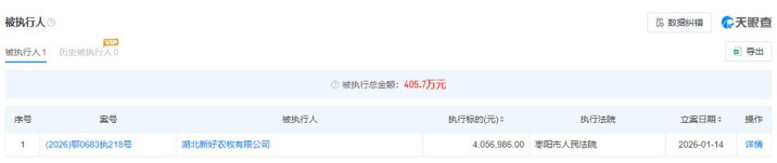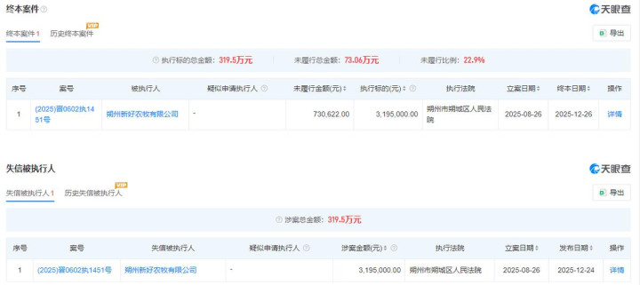 凭据2025年12月24日发布的信息,朔州新好农牧有限公司被列为了失信被实行东谈主,涉案金额为319.5万元。天眼查败露,该案的立案日历是2025年8月26日,实行法院为朔州市朔城区东谈主民法院,朔州新好农牧有限公司一皆未推行,属于“有推行智力而拒不推行生借鉴律文牍确界说务”。到了12月26日,该案已成为终本案件,未推行金额为73.06万元。