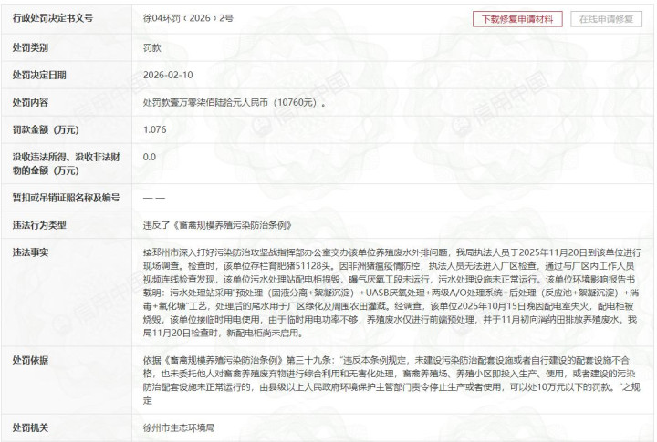 凭据信用中国的信息,徐州市生态环境局2025年11月20日到邳州新但愿六和农牧有限公司进行现场访问时发现,该单元浑水处理站配电柜损毁,曝气厌氧工段未起先,浑水处理表情未平日起先。由于2025年10月15日晚因配电室火灾,配电柜被放手,导致临时用电功率不够,衍生废水仅进行前端预处理,亚搏并于11月初向消纳田排放衍生废水。
