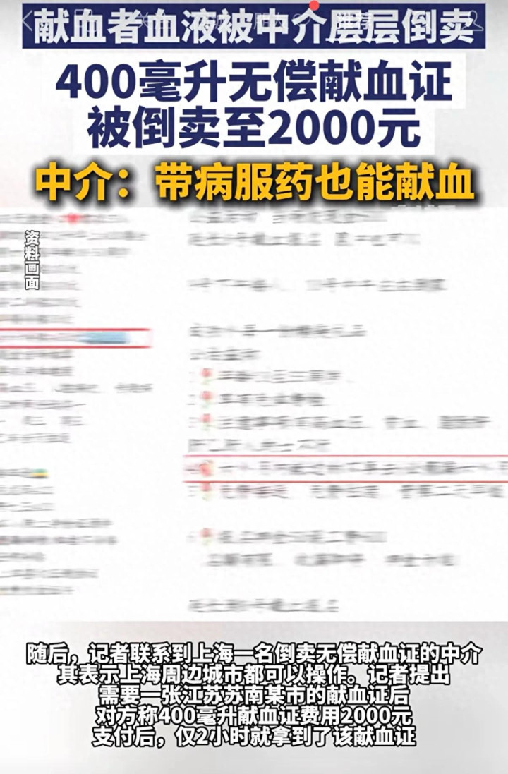 记者以“急需献血证”为由,关连到上海别称倒卖无偿献血证的中介。该中介宣称“上海临近城市齐能操作”,当记者明确建议需要“江苏苏南某市的献血证”时,对方平直报价“400毫升的证2000元”,并快乐“付款后2小时就能拿到证”。更令东说念主战抖的是,中介在疏导中败露“带病服药也能献血”——这一说法严重挣扎《献血法》中对献血者健康条款的严格要求,暴露出献血次序可能存在审核形同虚设的风险。