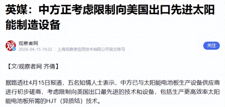 4月15日,路透社称中国官方已与太阳能电板板分娩开采供应商进行初步规划,究诘是否适度对好意思国出口最先进的太阳能制造手艺和开采,要点指向高恶果电板板所需的HJT(异质结)磋商装备。