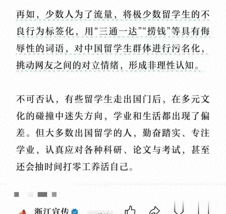很多人可能觉得这波批评有点突然,其实浙江宣传以前就这样,之前也怼过一些爆料女博主。官方基本操作就是挑几句流行词,直接给打上“帽子”——这回对留学生的评价看上去还是挺中立的。文中也说了,现在确实有一部分留学生走出国门后,混得不怎么样,有的学业荒废,有的出路也迷茫。但大部分还是挺上进的,勤工俭学、认真读书的也不少。