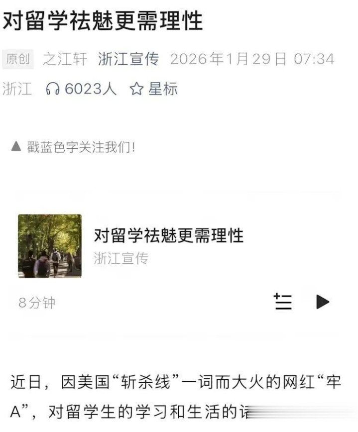 最近留学圈真的闹大了,浙江宣传一篇新文章直接把“留学乱象”这件事摆在了台面上,网上就炸了。虽然里面一句“劳A”都没提,但“三通一达”这些热词一出来,大家也懂是在说谁。网红“牢A”前阵子因为一句“美国斩杀线”火了,私底下各种大胆吐槽,直接带火了“留学祛魅”这个说法,也把当下出国留学变成全国都在议论的话题。