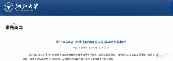 浙江大学近些年发展劲头很足, 就在1月28号那天,书记任少波领着队伍到了南宁, 和广西方面敲定了战略合作, 任少波还现场讲了个旧事, 说抗战那会儿浙大全校搬到广西宜山, 校训求是和校歌都是在那个地方确定的, 这次重新携手, 主要方向是人工智能, 产业升级以及中国与东盟的合作。