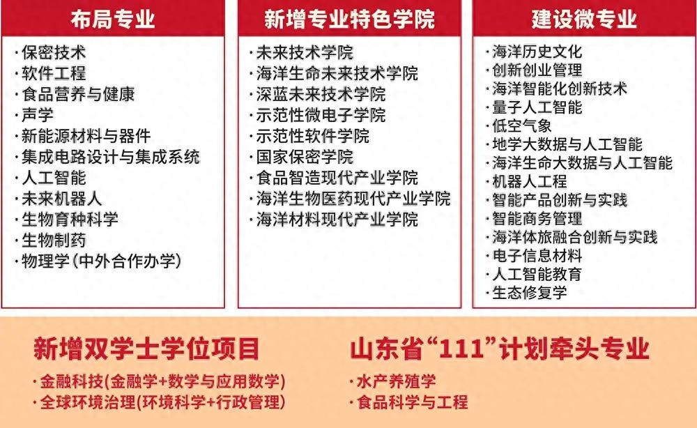 主动服务国家战略和区域经济社会发展,布局集成电路设计与集成系统、新能源材料与器件、人工智能等11个国家战略急需专业,新增海洋科学、海洋技术等2个强基计划招生专业,停招、撤销编辑出版学等11个专业,预警改造14个专业,建设量子人工智能等14个微专业,新增金融科技(金融学+数学与应用数学)、全球环境治理(环境科学+行政管理)等2个双学士学位项目。出台《中国海洋大学专业设置与建设管理办法》,专业动态调整机制更加完善。