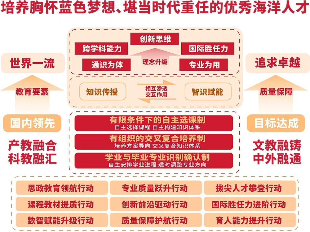 以此为基础,学校出台《中国海洋大学一流本科教育行动计划2030》,作为“十五五”期间,学校全面深化本科教育教学改革的纲领性文件,“计划”包含思政教育领航、专业质量跃升、拔尖人才攀登、课程教材提质、创新前沿驱动、国际胜任力进阶、数智赋能升级、质量保障护航、育人能力提升等九大行动,30条具体举措。通过5年坚持不懈努力,汇集一流生源、建设一流专业、打磨一流课程、锻造一流师资、夯实一流实践、提供一流保障,全面推进教学要素从国内领先到世界一流、质量保障从目标达成到追求卓越,培养更多胸怀蓝色梦想、堪当时代重任的优秀海洋人才,为建设教育强国、海洋强国作出更大贡献。