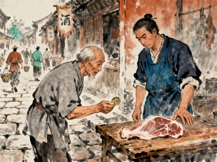 这老翁穿着一身洗得发白的青布褂子,背微微佝偻着,脸上布满了沟壑般的皱纹,一双眼睛浑浊无光,只是直勾勾地盯着肉案上剩下的一条里脊。