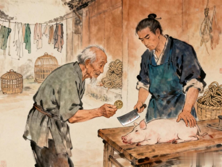 就在这时,一个干瘦的老翁,不知何时,悄无声息地站到了他的肉铺前。