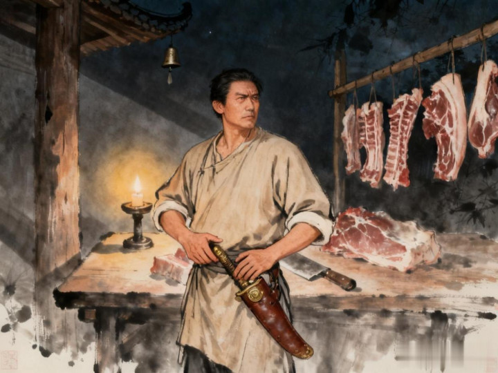 他家祖上三代都是屠夫,一把杀猪刀传到他手上,磨得只剩下窄窄的一条,却依旧锋利无匹。