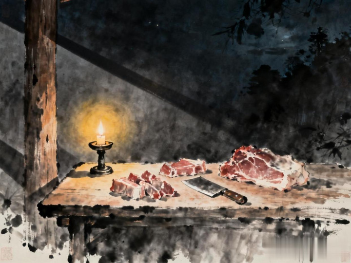 他坐在空荡荡的肉铺前,看着天边最后一丝光亮被黑暗吞噬,长久地没有动弹。