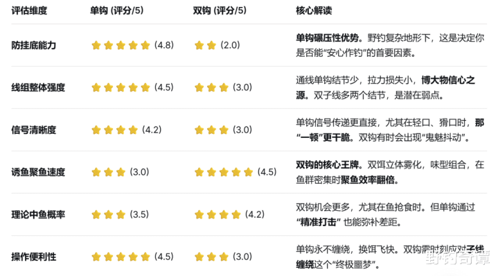 结论一目了然: 单钩在“生存能力”(防挂、强度)和“操作效率”上占优;双钩在“进攻能力”(诱鱼、概率)上领先。不存在全面胜出者。