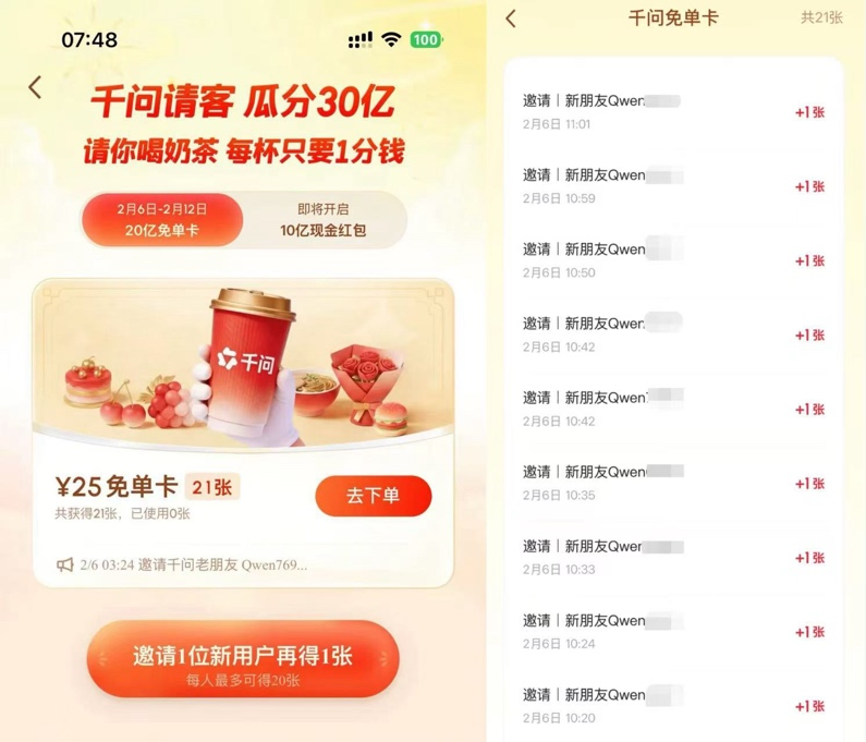 【环球网科技综合报道】2月7日消息,千问APP在微博上呼吁:“免单卡可以一直用到2月28号,还有21天可以用。这两天是奶茶下单高峰期,大家可以先集满21张卡,慢慢错峰下单,我们保证大家的免单卡一定能用掉哈。”