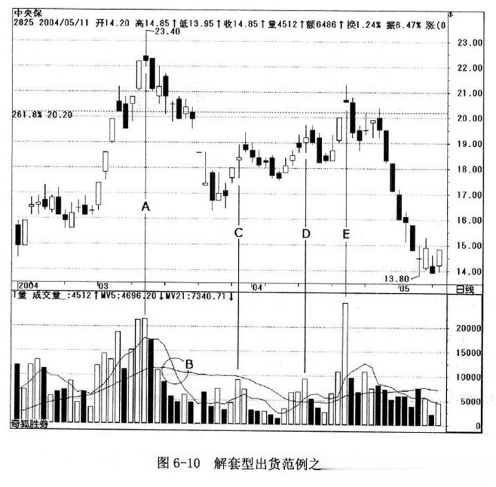 请看图6-10,中央保股价利用黄金螺旋计算,其中2.618倍幅的目标=(11.3-5.8)×2.618+5.8=21.20元,股价穿越满足后拉高在标示A的当天暴出大量止涨,亚搏app随即进行拉回修正并在标示B出现量能退潮的现象,此时已经完成反转型出货的走势。