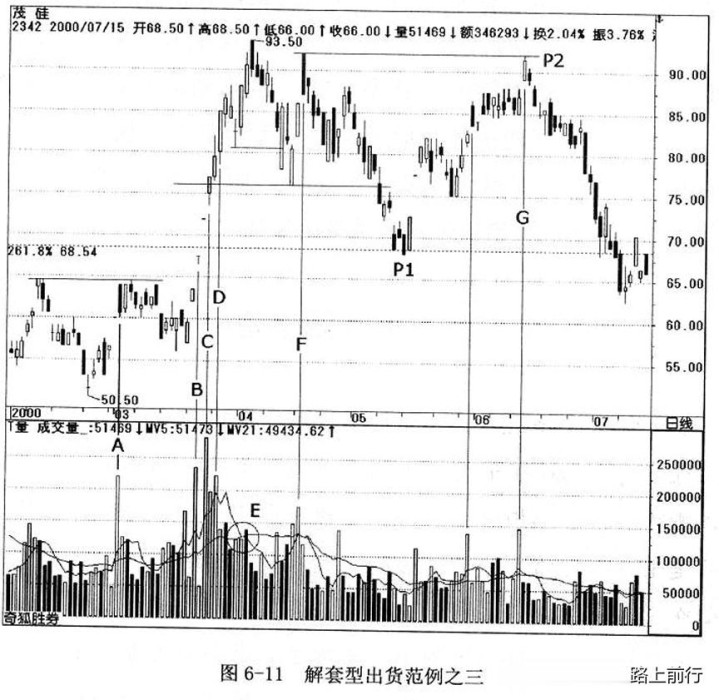当股价完成头部修正到P1点后,股价进行强势反弹,在标示G出现中指量,并撞到头部第二头,隔一笔K线出现止涨,但是没有穿越第二头的高点,显见头部压力相当重,亦即没有针对头部解套,随后K线形成回转线,从P1~P2的这段上涨,就主力出货模式而言,正是不折不扣的解套型出货,股价则从此处开始下跌到5.25元才出现象样的反弹,最后还曾因为利空下跌到1.49元,暂时停止上市后,才又减资重新上市交易。假设当时套在P1~P2的“波段诱多”,金钱上的损失实在是难以估计。