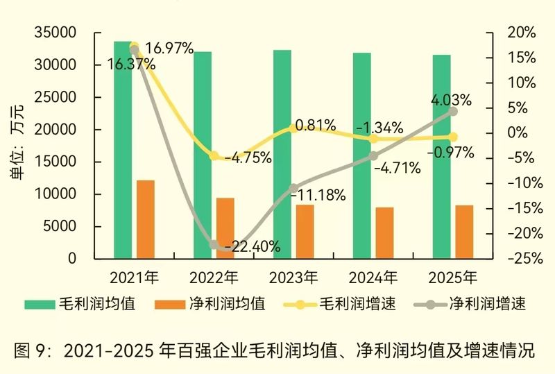 阐扬涌现,2025年百强企业营收均值16.60亿元,增速与2024年基本握平,反应出营收增速正步入郑重通说念。2025年,百强企业毛利润均值为3.16亿元,同比着落0.97%,降幅收窄。