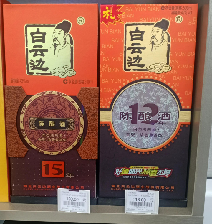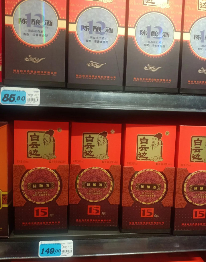 如15年白云边白酒和12年白云边白洒,“中百罗”挂牌价为193元和118元。同一街面大型超市的挂牌价仅为149元和85元。