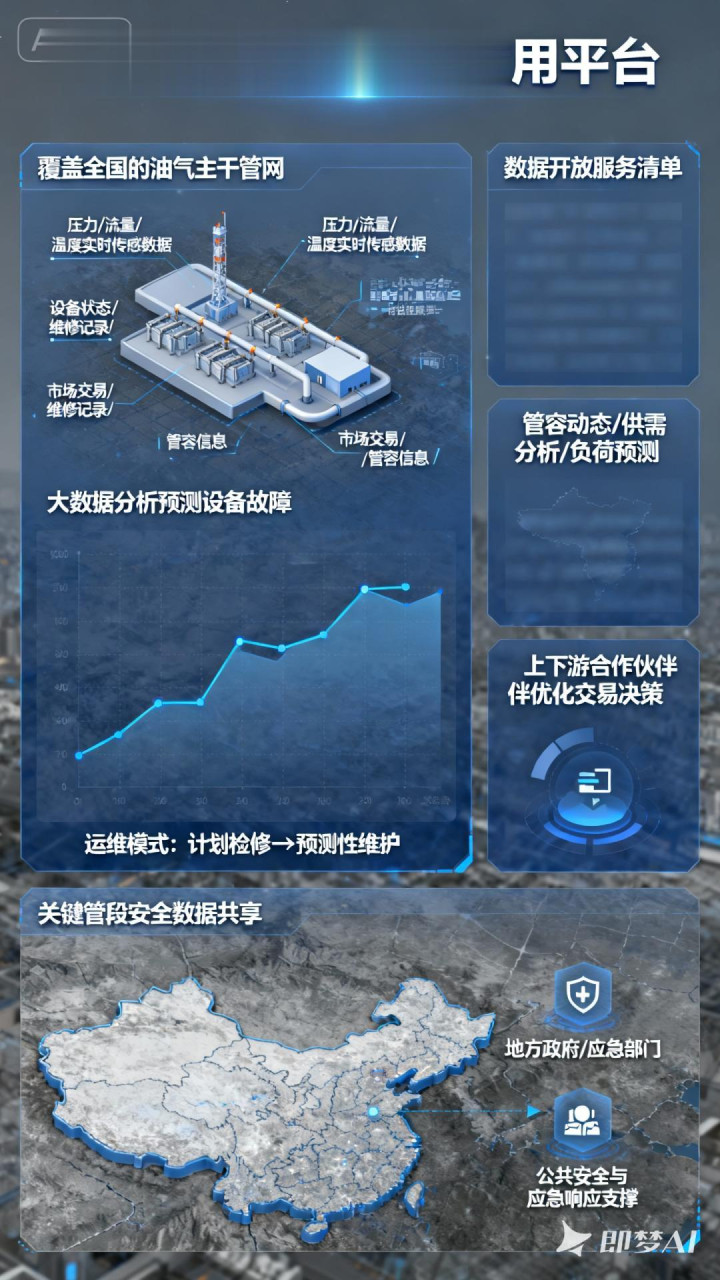 依托覆盖全国的油气主干管网,国家管网系统汇集了压力、流量、温度等实时传感数据,以及设备状态、维修记录、市场交易、管容信息等多维数据。通过大数据分析预测设备故障,推动运维模式从“计划检修”向“预测性维护”转变。同时,细化“数据开放服务清单”,面向上下游合作伙伴提供管容动态、供需分析、负荷预测等服务,助力资源方与客户优化交易决策。此外,与地方政府、应急部门共享关键管段安全数据,也为公共安全与应急响应提供了有力支撑。
