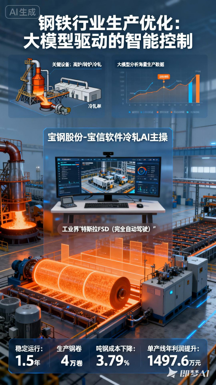 以钢铁行业为例,在生产优化方面,大模型可通过分析海量生产数据,实现对高炉、转炉、冷轧等关键设备运行状态的精准预测与智能控制,降低能耗、提高产量与质量稳定性。如宝钢股份与宝信软件联合研发的冷轧AI主操,实现工业界“特斯拉FSD(完全自动驾驶)”,已稳定使用超过1.5年,生产钢卷超4万卷,投用率超过90%,吨钢成本下降3.79%,单产线年提升利润1497.6万元。