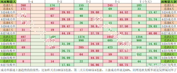 这组数据已不是第一天提示风险了,现在基本找不到连涨个股了,就算让你找到,胜率只有20%左右,6进7为啥强?我认为是抱团的结果。超跌反弹也不行,胜率比追涨更差,而且真实数据越来越大,明天再回调估计7连跌也有200+以上,更别说3连跌了。这代表整体市场是偏空的,如果说胜率不行,反过来就是败率可以,做空反而是有更高概率获利的,对应的应该是融券或期指空单,如果你只有做多的工具,这个时候我认为回避风险是第一要务,你总不能在这样低胜率的情况下觉得明天一定会反转,这就像T-3的数据,如果你认为40%的胜率够了,那上周基本就全程吃满暴击伤害,对吧?在量化高频情况下,只要本金还在,什么都好说!
