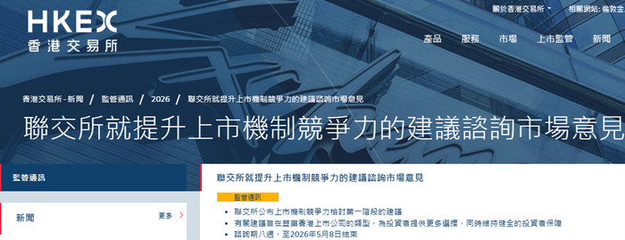 [全球网财经轮廓报谈]3月13日,香港往来及结算总共限公司(港交所)发布盘算推算文献,就提高港股阛阓上市机制竞争力的建议盘算推算阛阓认识。这次变嫌建议涵盖优化不同投票权(WVR)上市限定、便利国外刊行东谈主来港上市以及扩大IPO守密央求范围等中枢议题,盘算推算期将于5月8日限制。