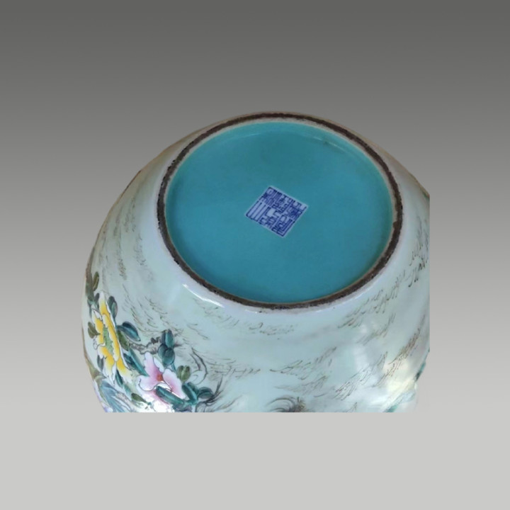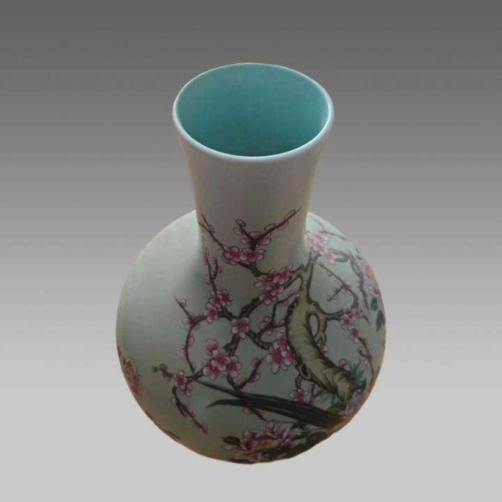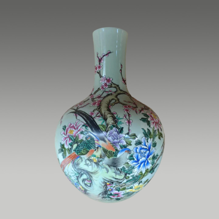 瓷质莹润细腻,瓶身花鸟图绘工致鲜活,牡丹盛放、梅枝吐艳,绶带鸟灵动雅致,尽显华贵雅致的东方韵致