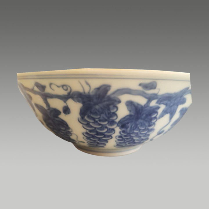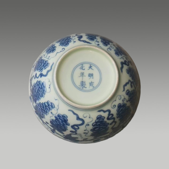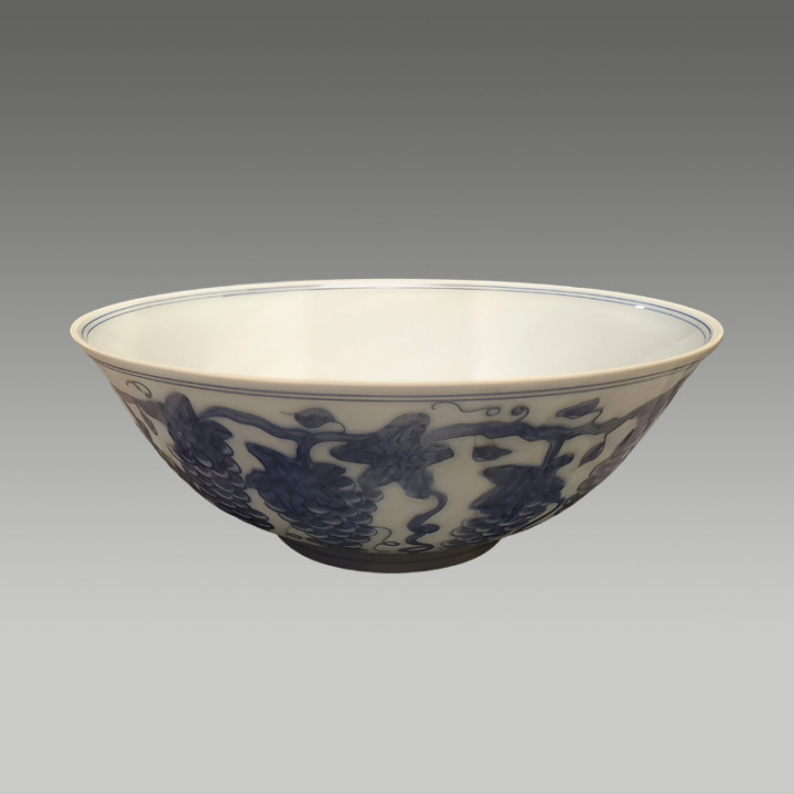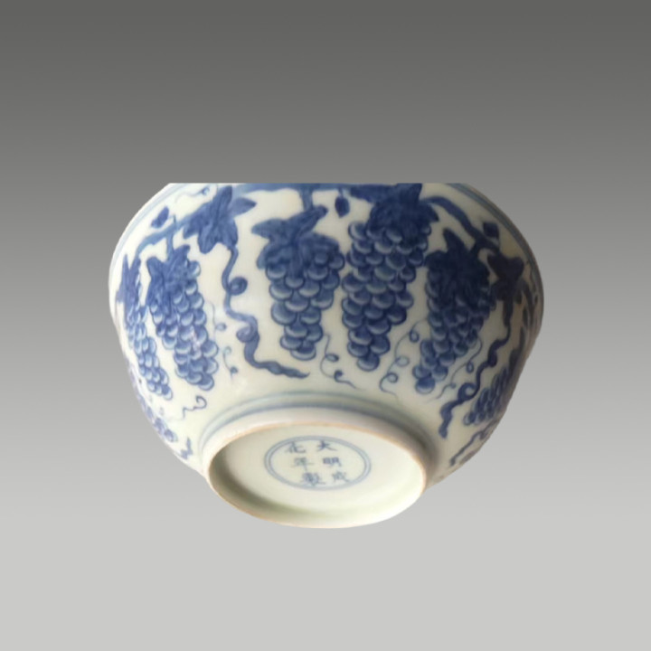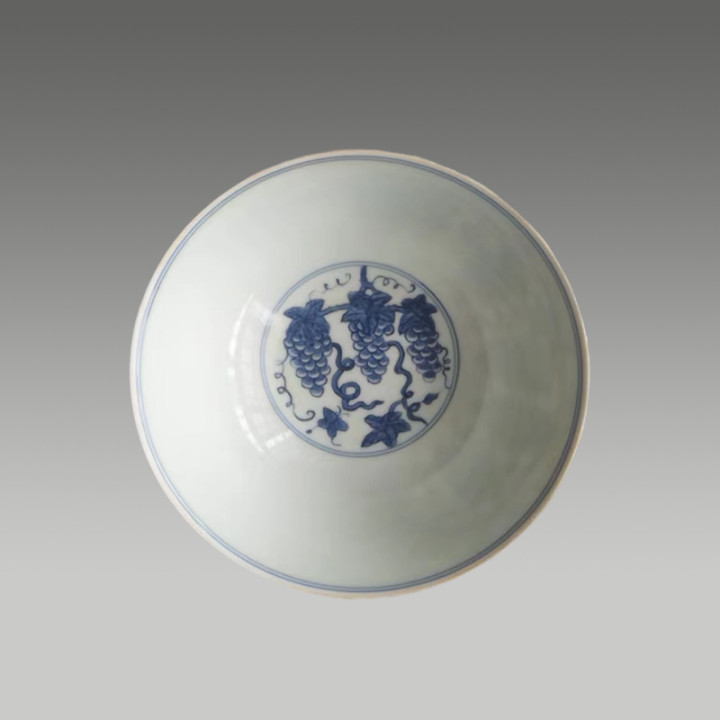 青花淡雅,葡萄纹饱满鲜活,藤蔓缠绕间尽显雅致灵动,釉色温润莹润,兼具艺术美感与吉祥寓意