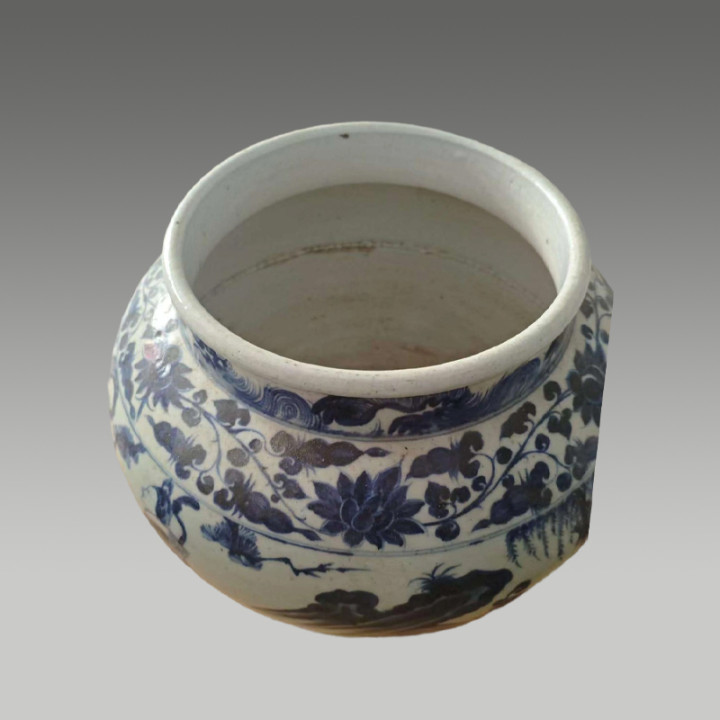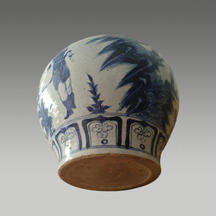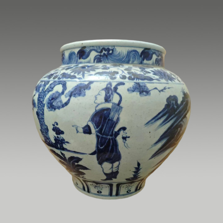 器形饱满端庄,青花发色浓艳明丽,人物纹饰线条流畅、神态生动,辅以松竹花草点缀,尽显古朴雄浑的传统韵味