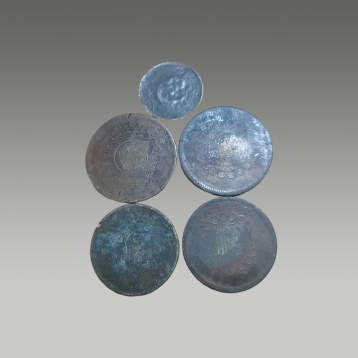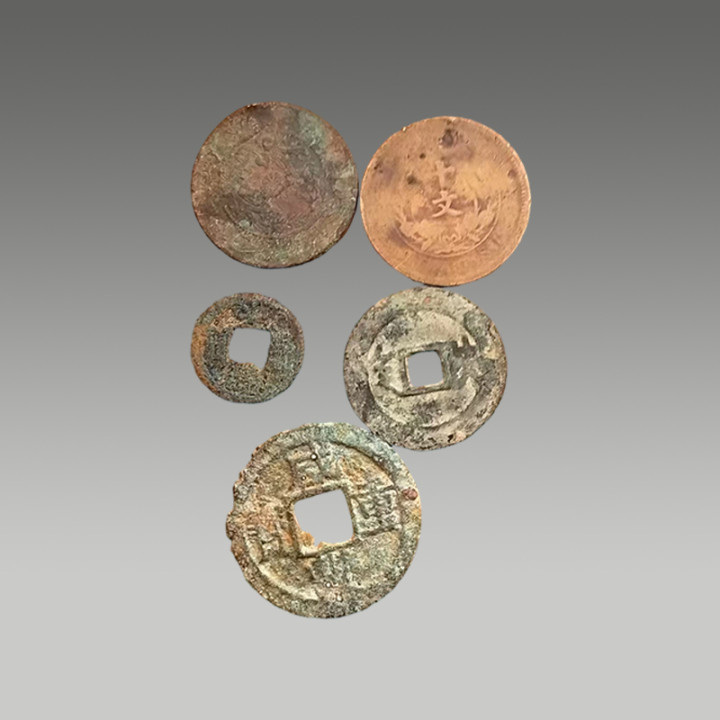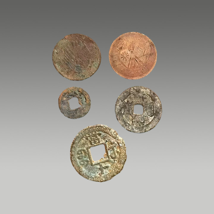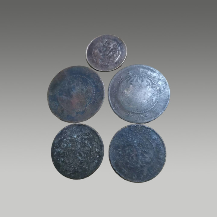 这五枚古钱币制造工艺精湛,币面图案清晰,锈色及包浆自然,因存世量有限,具有一定的市场价值