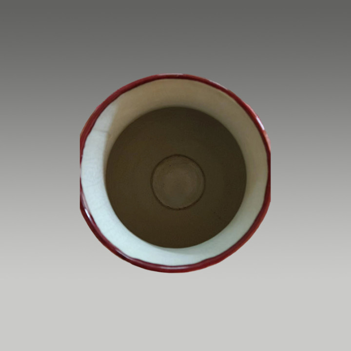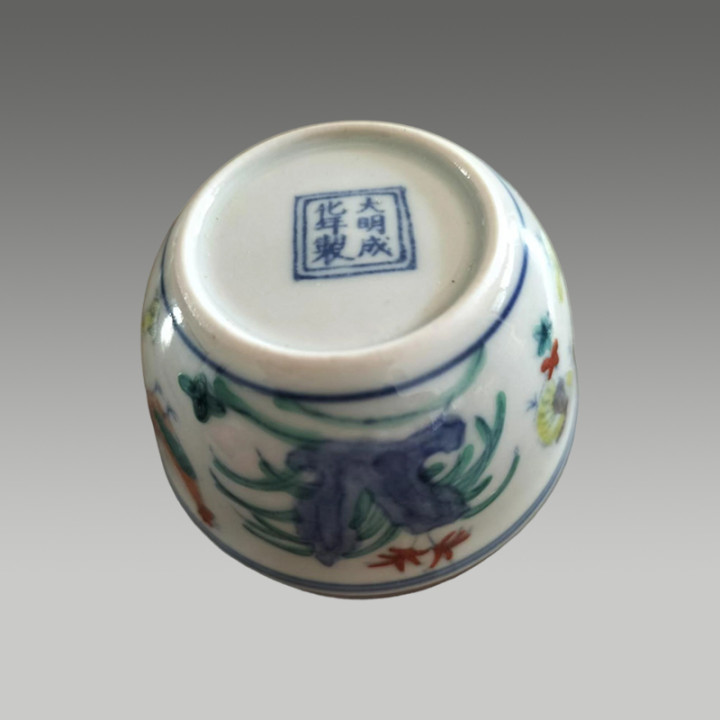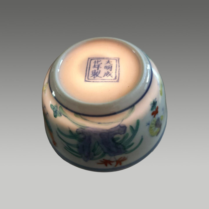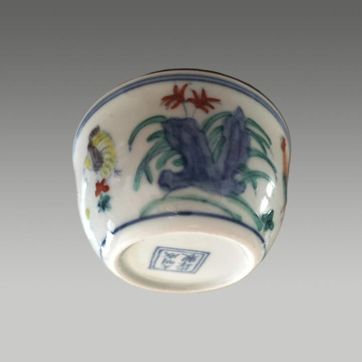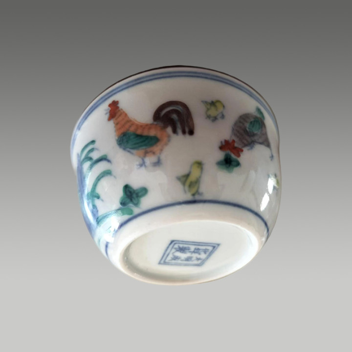 敞口、弧壁、卧足的经典造型,外壁绘有公鸡、母鸡、雏鸡及山石、花卉等图案,整体构图是鸡缸杯的典型布局