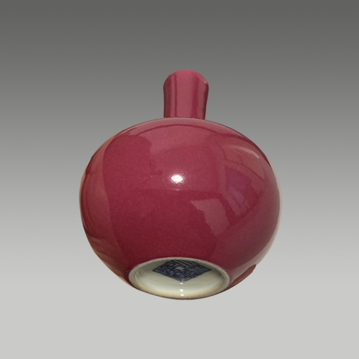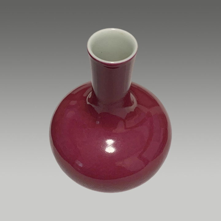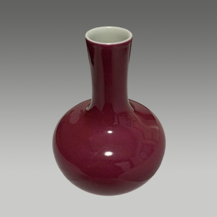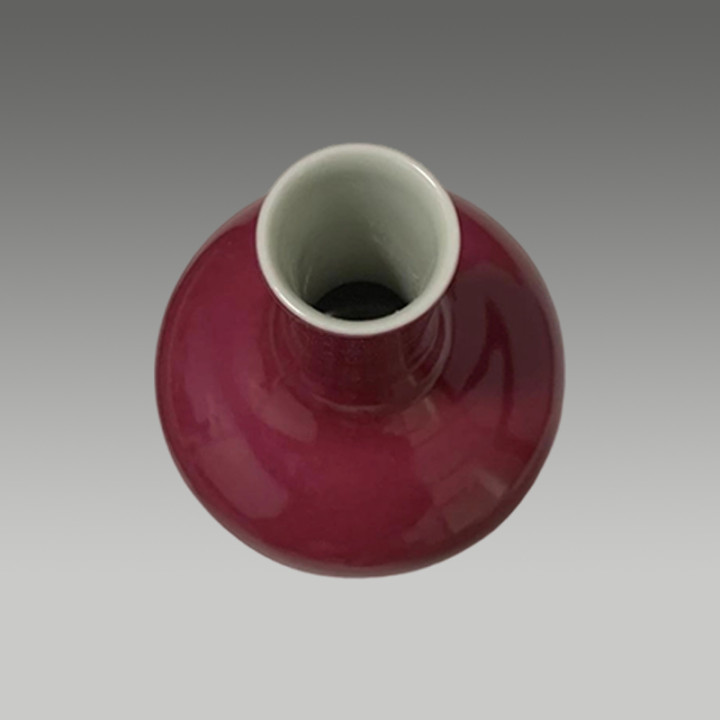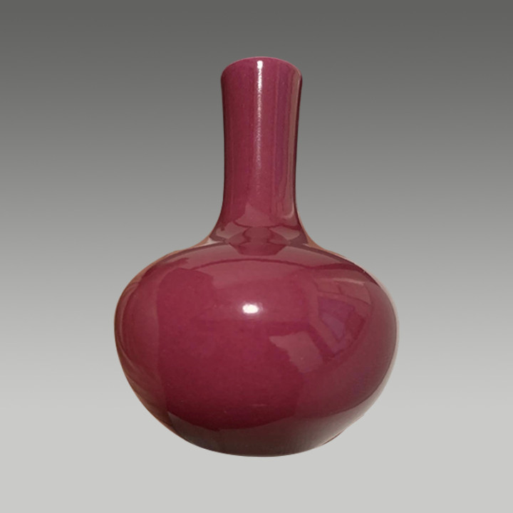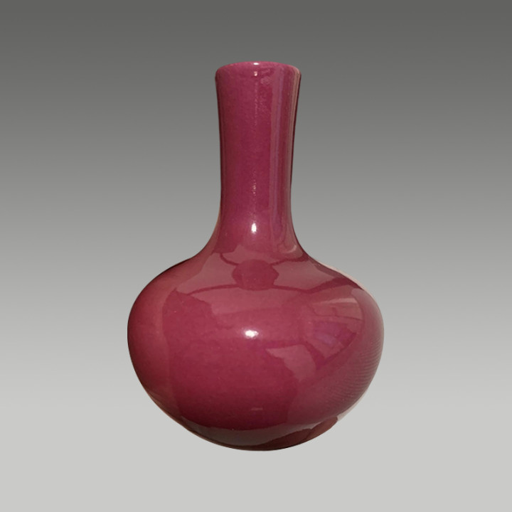 这是一件胭脂红釉长颈瓶,釉色匀净莹润,器型典雅规整,兼具审美价值与收藏潜力