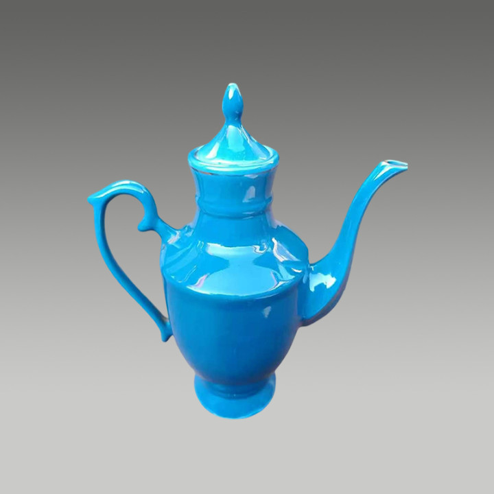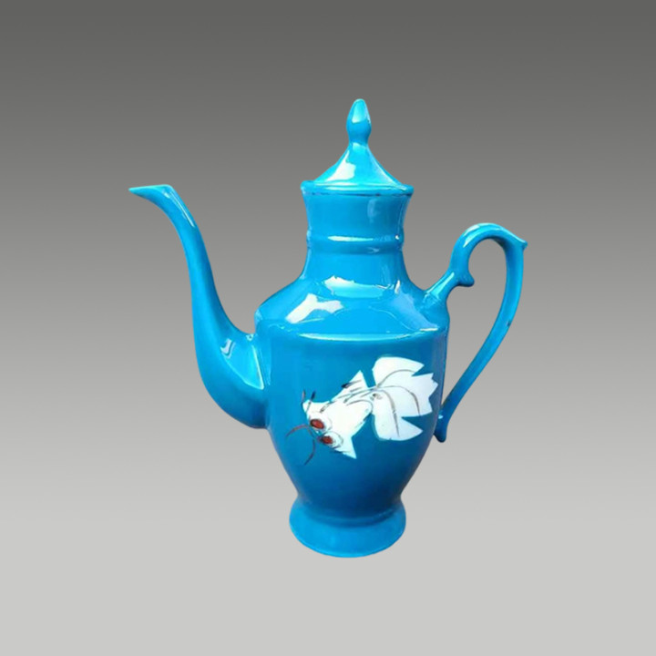 以孔雀蓝釉为底色,采用“留白”工艺在壶身装饰金鱼纹样,色彩对比鲜明,寓意“金玉满堂”