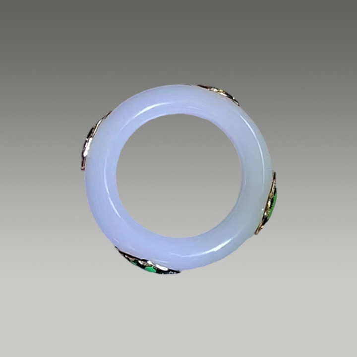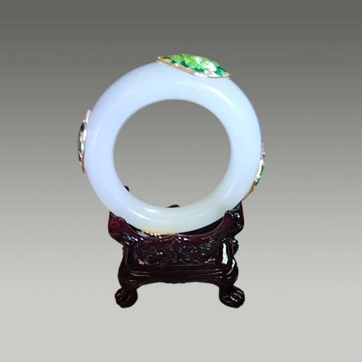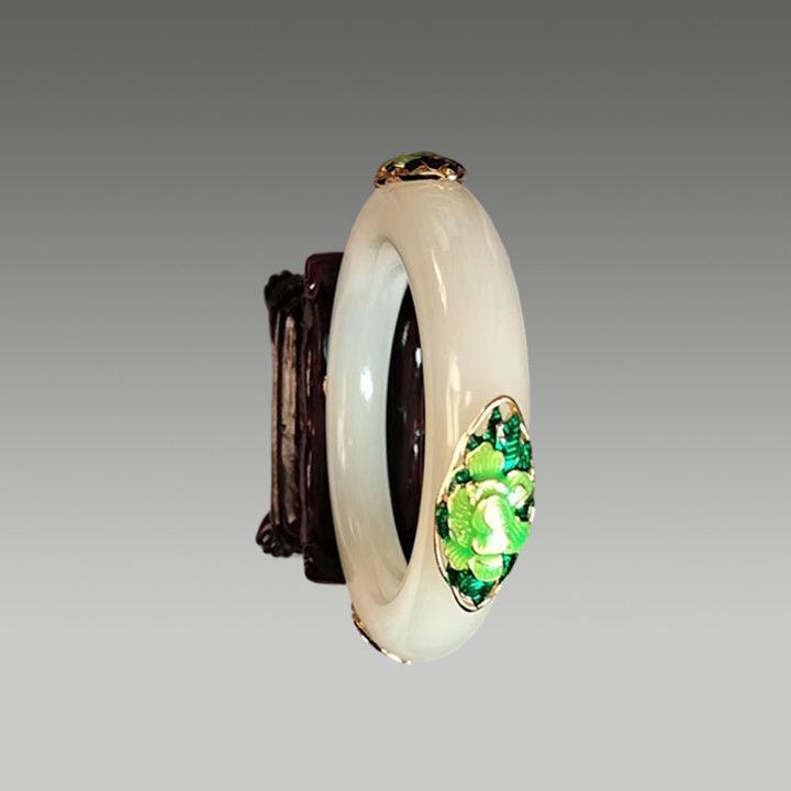 玉质温润洁白,镯身点缀绿釉珐琅彩花卉纹饰,工艺精致。融合玉石的典雅与珐琅彩的艳丽