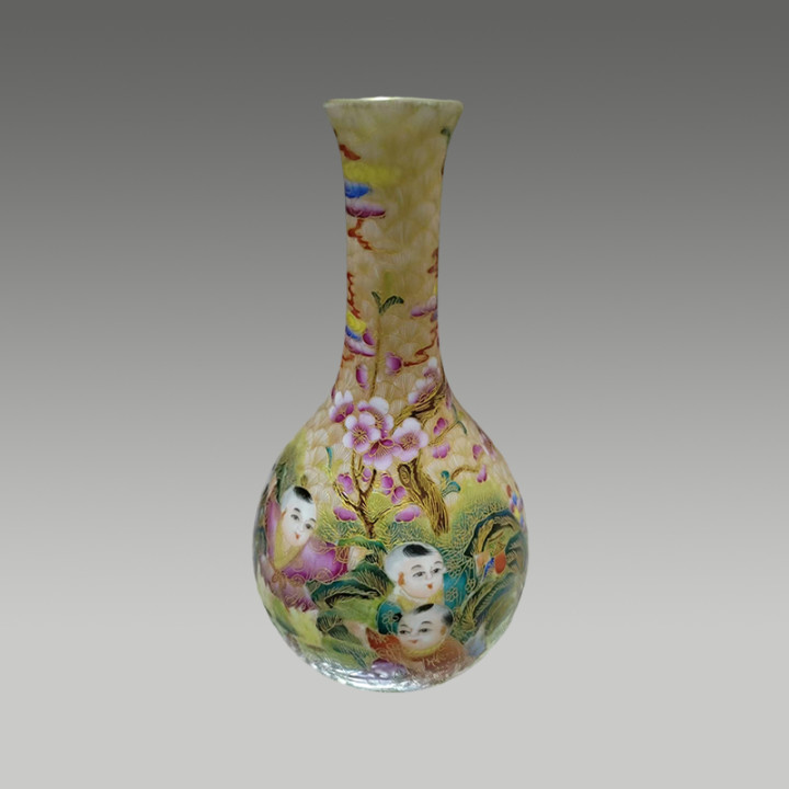 婴戏图象征多子多福,生活美满,梅花寓意坚韧高洁,迎春纳福,是传统中式花瓶的经典造型