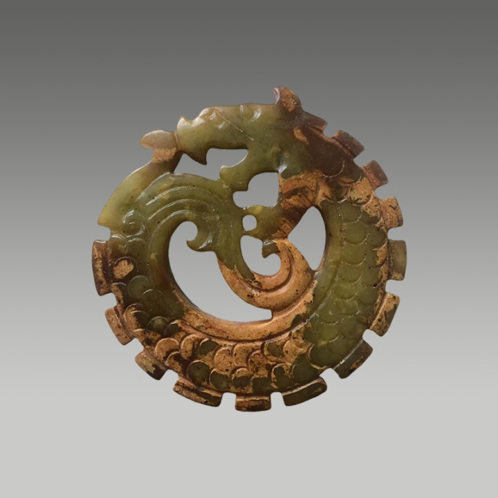 主体为黄玉质地,表面带有自然的红褐色土沁,局部有钙化痕迹,线条刚劲洗练,是当时玉雕工艺的代表作品