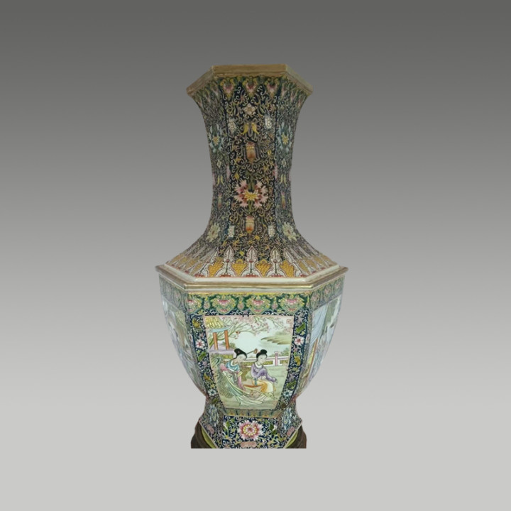 这件珐琅彩六棱造型挺拔端庄,墨地珐琅彩缠枝花卉繁复华美,开窗仕女图细腻传神,极具收藏价值