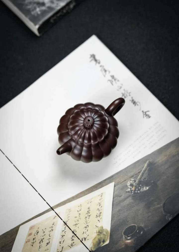 案头一盏壶,静静地立着。原矿老紫泥的色泽,是岁月窖藏般的沉静,并非一味的黯哑,而是在温润的光泽下,透着一股子内敛的暖意。壶型是经典的莲子,却非浑圆无迹,周身被“无极筋纹”自上而下地贯通、分割。那一道道浅而挺括的凹线,匀亭有致,从壶钮的顶端生发,如涟漪般向下铺展,经过壶盖,越过壶肩,最终收束于壶底,仿佛有一种看不见的、严谨的秩序与生命力,被匠人的手牢牢地封印在了这方寸泥土之中。