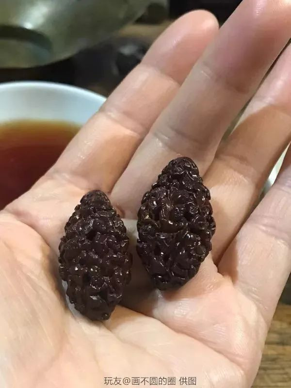 玩友@画不圆的圈 平时喜欢收一些老货。这橄榄核只有两颗,平时用来搭配串儿,收来的时候,开始包浆是红色,玩到现在,颜色竟有些变紫色了!