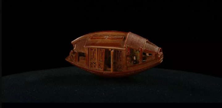 他雕刻的橄榄核舟,底部雕刻着300多字的《后赤壁赋》,船上乘坐8人,每一人的神态都不一样。可以说是鬼斧神工。