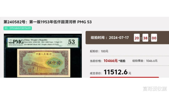 在2024年7月17日的“春秋大拍”中,一张1953年的“渭河桥版五千元”,PMG评级53分,最后拍出了11512.6元。