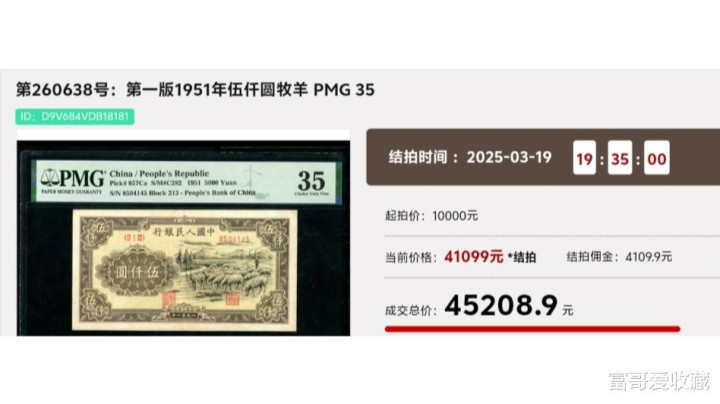 在今年3月份的“春秋大拍”中,一张1951年的“牧羊版五千元”,PMG评级只有35分,最后却拍出了45208.9元。