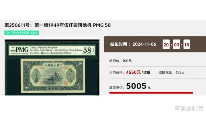 在2024年11月6日的“春秋大拍”中,一张1949年的“耕地机版五千元”,PMG评级58分,最后拍出了5005元。
