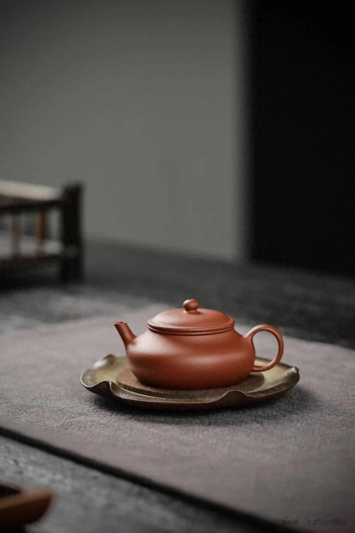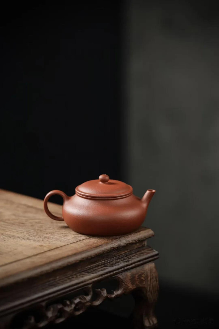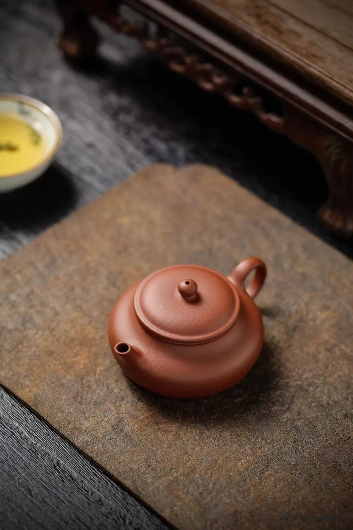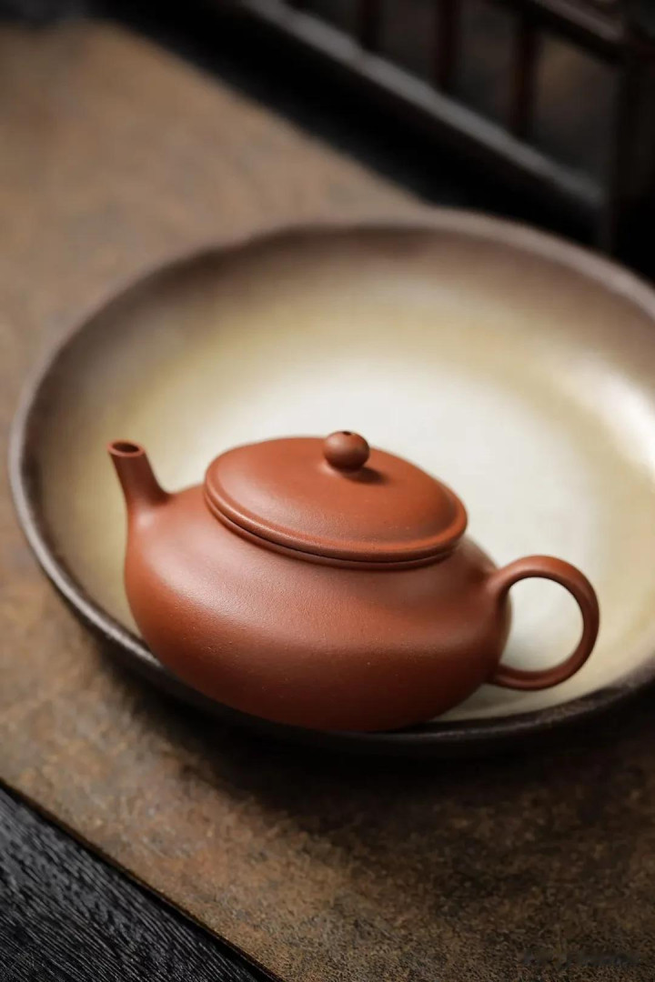 细看这壶身,是极为简约的现代审美。没有繁复的刻绘,也无多余的线条,只凭一弯流畅的瓢形轮廓与柔和的朱红色彩说话。那红,不是夺目的艳,而是矿土本真的、温润的赤色,像秋日里最后一片枫叶沉淀下的光泽,又似经年把玩后,从器物骨子里透出的暖光。它简到极致,却因此容纳了更多的想象与安宁。置于素净的茶席上,它自身便成了一道风景,不喧宾,不夺主,只是安定地存在着,与一方木、一茎花、一卷书,自然地融成一幅生活的小品。