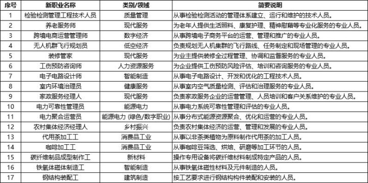 人社部在2025年7月发布的第七批新职业,共包括17个新职业和42个新工种,这17个新职业中大部分都是技能类。