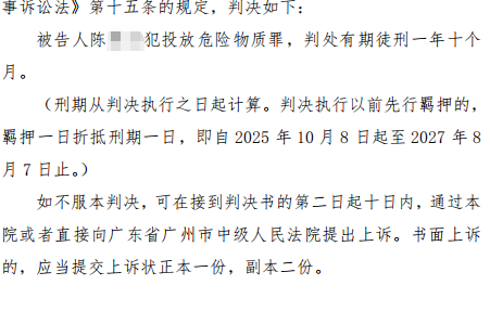 {jz:field.toptypename/}庭审结束后,南沙区法院当庭宣判。该院审理认为,公诉机关指控陈某文犯投放危险物质罪事实清楚,证据确实、充分,应予支持。陈某文认罪认罚且于庭前签署具结书,可以从宽处理。综合本案的性质,情节,危害后果及陈某文的认罪态度,陈某文犯投放危险物质罪,判处有期徒刑一年十个月。