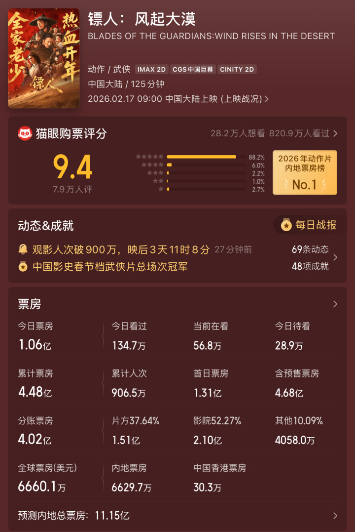 春节档的电影里,《镖东说念主:风起大漠》凭硬核功夫时局、全员在线的演出,实现了上映前不被看好的口碑逆袭,上映4日票房破4亿、评分稳守 7.5 分,成为本年新春档最颠簸的一部佳作。