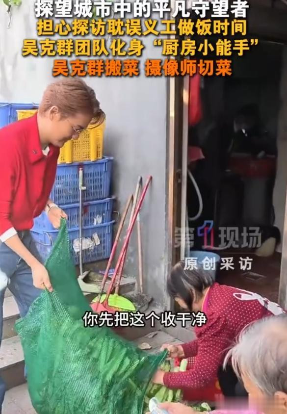 在奶奶们离开之后,吴克群便和他的责任主说念主员以及一些粉丝开动了在爱心餐厅的渊博责任,包括洗菜等等。