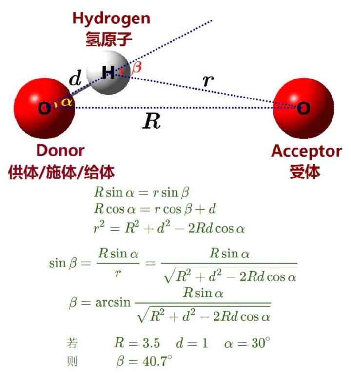氢键是一种常见而又神奇的分子间互相作用,不错把它思象要素子之间的“看不见的手”——不像共价键那样把原子紧紧绑在一皆,也比庸碌的范德华力强得多。最典型的例子是水分子之间的互相眩惑:一个水分子的氢原子带着部分正电,会被另一个水分子上的氧原子的孤对电子眩惑,于是两个水分子就配对了。下图展示了氢键判定范例的几何准则所对应的结构图。